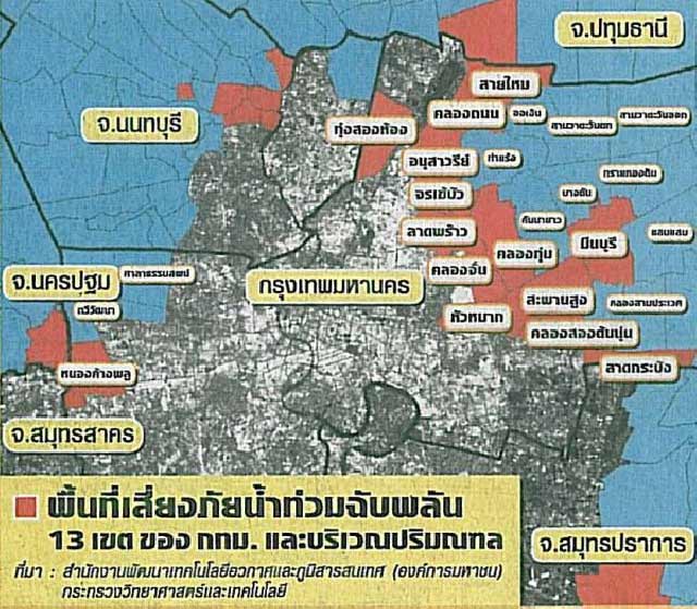ดร.อานนท์ สนิทวงศ์ ณ อยุธยา ผอ.สำนักงานพัฒนาเทคโนโลยีอวกาศและภูมิสารสนเทศ (องค์การมหาชน) : สทอภ. หรือ GISTDA หน่วยงานในสังกัดกระทรวงวิทยาศาสตร์และเทคโนโลยี ได้เผยภาพจากดาวเทียม แสดงพื้นที่เสี่ยงภัยที่จะเกิดน้ำท่วมกรุงเทพฉับพลัน ในช่วง 3-5 วันที่จะถึงนี้ ใน 13 เขตของกรุงเทพมหานคร ได้แก่
