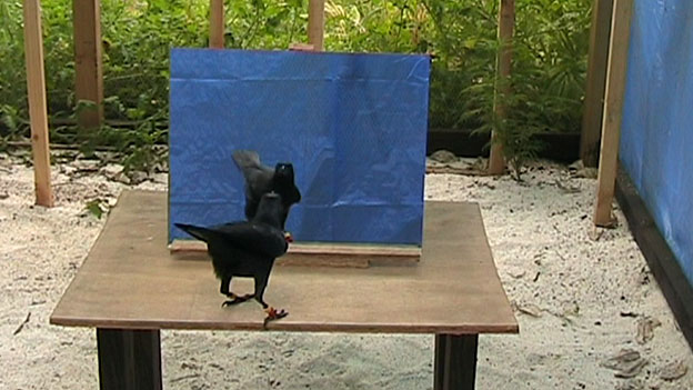 นกกานิวคาลีโดเนีย 10 ตัวถูกจับในขังไว้ในกรงขนาดใหญ่ เพื่อให้วิทยาศาสตร์ได้สังเกตและบันทึกพฤติกรรมของนกที่ตอบสนองต่อกระจก ซึ่งผลจากการทดลองทางบีบีซีนิวส์ระบุว่า กาทั้งหมดมีปฏิกิริยาต่อภาพสะท้อนของตัวเองราวกับเผชิญหน้ากับคู่แข่ง โดยแสดงอาการยื่นหัวไปข้างหน้า ยกหางขึ้นสูง หรือแม้กระทั่งเข้าโจมตีภาพสะท้อนที่เห็น ซึ่งปฏิกิริยาที่เป็นปฎิปักษ์ต่อภาพสะท้อนของตัวเองนี้ ทาง เฟลิเป เอส เมดินา โรดริกิซ (Felipe S Medina Rodriguez) หัวหน้าทีมวิจัยนี้กล่าวว่า ไม่ใช่เรื่องแปลก