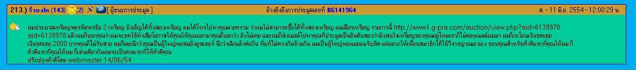 ผมได้คำติมา 2 คำติ คำติแรกเกิดจากเป็นสมาชิกน้องใหม่เลยคันมือเคาะพระรุ่นเดียวกันสององค์แล้วชนะการประมูลทั้งสององค์ ก็เลยจำเป็นต้องขอยกเลิกหนึ่งรายการ แล้วได้คำติมาว่า ประมูลได้แล้วขอยกเลิก ก็เลยให้คำติกลับแก่ผู้ตั้งประมูลแล้ว webmaster ก็แก้ไขคำติเป็นคำชมภายใน 3 วัน ขอย้ำว่า สามมมมมมมมมม วันนะครับ แต่