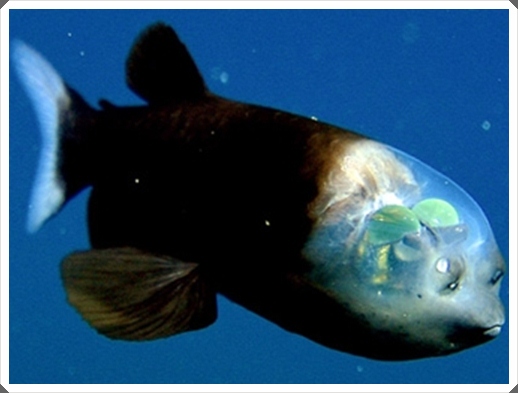 ..Pacific barreleye fish.. หรือ ..Macropinna microstoma.. พบในในน้ำลึกมากกว่า 2000 ฟุต ..600 เมตร.. บริเวณเขตน่านน้ำ แคริฟอร์เนียกลาง ..California's central coast.. บริเวณที่แสงอาทิตย์ส่องลงไปไม่ถึง มีหัวเป็นโดมโปร่งใสมีขนาดลำตัวยาวประมาณ 6 นิ้ว ..15 เซ็นติเมตร.. บริเวณส่วนหน้าที่เห็น 2 จุดเล็กนั้นไม่ใช่ตาแต่เป็น อวัยวะรับกลิ่น จุดเด่นคือส่วนหัวด้านบนที่โปร่งแสงจนเห็นอวัยวะภายในคล้ายช่องคนขับเครื่อง บินรบ .. fighter-plane pit .. ส่วนลำตัวนั้นไม่โปร่ง พวก มันกินปลาตัวเล็กๆ รวมทั้งแพลงตอนเป็นอาหาร และเนื่องจากปลาชนิดนี้มีลำตัวสีดำ แถมยังสามารถลอยนิ่งๆ ใต้ท้องทะเลอันมืดมิด ทำให้บางครั้งเหยื่อไม่ทันสังเกต จึงตกเป็นอาหารอันโอชะของพวกมันได้อย่างง่ายดาย อย่าง ไรก็ดี บริเวณส่วนหัวที่โปร่งใสของปลาชนิดนี้ เต็มไปด้วยของเหลวใสและเป็นอะไรที่เปราะบางมาก ด้วยเหตุนี้เวลาที่นักวิจัยพยายามใช้แหจับพวกมันขึ้นมาศึกษา ส่วนหัวของพวกมันจึงมักถูกทำลายก่อน และเมื่อไหร่ก็ตามที่หัวใสๆ ของมันถูกทำลายหรือแตกออก ดวงตาของพวกมันก็จะทะลักออกมาตามแรงดันของน้ำลึก และทำให้พวกมันตายในที่สุด.....ด้วยเหตุนี้ ในอดีตที่ผ่านมาจึงยังไม่เคยมีนักวิจัยคนไหน จับปลาชนิดนี้เพื่อศึกษาแบบ