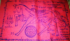 ชาวบ้านประมาณ 20 กว่าคน นำผ้ายันต์สีแดง รูปม้ามีเพศสัมพันธ์กับหญิงเปลือย ขนาดประมาณ 30x30 เซนติเมตร มีอักขระยันต์เขียนไว้โดยรอบ และมีระบุชื่อ พระอธิการพรหม กิจจกาโร เจ้าอาวาสวัดจำปาหล่อ ไว้บนผ้ายันต์อย่างชัดเจน