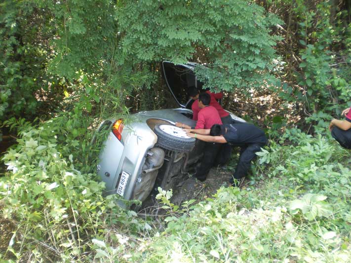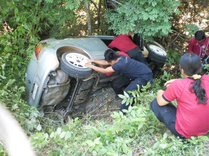 เจ้าของรถเป็นผู้หญิง จอดรถบนไหล่ข้างทางซึ่งเป็นกอหญ้าเล็กๆ+กับฝนตกดินอุ้มน้ำอยู่ตลอดเวลา ทำให้รถคันดังกล่าว ไหลออกด้านข้างตกไปในไหล่ถนนซึ่งสูงชั้นมากครับ