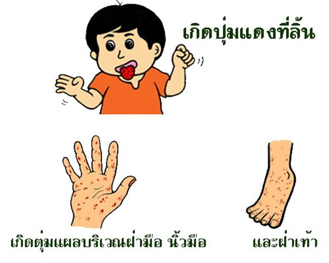 เด็กที่ป่วยเป็นโรคมือ เท้า ปาก จะมีไข้ต่ำ และอ่อนเพลีย ใน 1-2 วันแรกที่ร่างกายได้รับเชื้อไวรัส หลังจากนั้น จะมีอาการ เจ็บปาก เกิดเป็นตุ่มแดงที่ลิ้น เหงือก และกระพุ้งแก้ม ตุ่มแดงจะค่อยๆ กลายเป็นตุ่มพองใสและแตกออก กลายเป็น แผลหลุมตื้นๆ นอกจากจะพบตุ่มแผลในปากแล้วยังพบที่บริเวณฝ่ามือ นิ้วมือ ฝ่าเท้า และบางครั้งอาจพบ ที่ก้นด้วย ซึ่งตามปกติร่างกาย จะสร้างภูมิต้านทานขึ้น มากำจัดไวรัสบางส่วนออกไปจากร่างกาย ทำให้อาการต่างๆ เหล่านี้ หายไปได้เองภายใน 7-10 วัน ผู้ป่วยบางคนอาจได้รับเชื้อ Enterovirus 71 ซึ่งมีความรุนแรงกว่า Coxackievirus โดยมักจะมีอาการทางระบบประสาทร่วมด้วย ซึ่งสามารถทำให้ผู้ป่วยที่เป็นเด็กเล็กๆ เสียชีวิตได้จากโรคแทกซ้อน ที่ตามมาเช่นโรคสมองอักเสบ โรคเยื่อหุ้มสมองอักเสบ โรคกล้ามเนื้อหัวใจอักเสบ เป็นต้น |