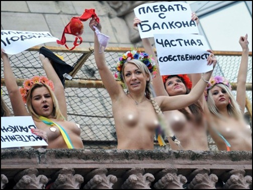 ซึ่งกลุ่มที่เคลื่อนไหวครั้งนี้ เป็นกลุ่ม นักเคลื่อนไหวสตรี ของ ยูเครน ที่ชื่อว่า ฟีเมน การประท้วง เปลือยอก เกิดขึ้น ที่ระเบียงของอาคารแห่งหนึ่ง ใน กรุงเคียฟ พร้อมตะโกน และ ชูป้าย ..ระเบียงเป็นทรัพย์สินส่วนบุคคล.. และ ..นี่คือระเบียงของคนหัวรั้น..