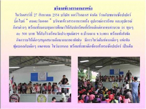 ด้วยวันเสาร์ที่ 1 กันยายน 2555 บริษัท แอร์โรคลาส จำกัด ร่วมกับชมรมช๊อปเปอร์บิ๊กไบค์ ฅนตะวันออก จัดโครงการ "เติมฝัน ปันให้น้องปี 2" โดยจะทำการมอบทุนการศึกษาทุนละ 500 บาท ให้กับนักเรียนที่ยากจน และมอบของเล่นอุปกรณ์กีฬาข้าวสารอาหารแห้ง ให้กับโรงเรียนบ้านเขาห้วยมะหาด( บ้านเขาภูดร ) ต.บ้านฉาง อ.บ้านฉาง จ.ระยอง จึงขอเขิญพี่น้องชาวแอร์โรคลาสทุกท่านทำบุญและร่วมบริจาค ของเด็กเล่นอุปกรณ์กีฬาหรือทุนการศึกษาให้กับนักเรียนยากจนในโครงการดังกล่าว