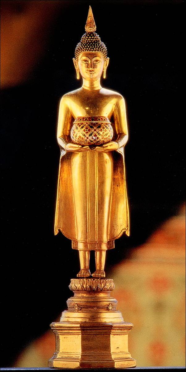พุทธลักษณะ .. เป็นพระพุทธรูปประทับยืนแบบสมภังค์แสดงปางอุ้มบาตร โดยพระหัตถ์ทั้งสองประคองบาตรทางเบื้องหน้าพระองค์ พระพุทธรูปมีพระพักตร์ค่อนข้างกลม พระนลาฏค่อนข้างแคบ พระขนงโก่ง พระเนตรเหลือบต่ำ พระนาสิกโด่ง พระโอษฐ์เรียว และพระกรรณยาว พระเศียรประดับด้วยเม็ดพระศกเล็กแหลมมีเกตุมาลาและรัศมีรูปเปลวไฟ พระพุทธรูปครองอุตราสงค์ห่มคลุมเรียบไม่มีลวดลายประดับ ทิ้งชายอุตรสงค์ตกลงข้างลำพระองค์ทั้งสองข้าง อันตรวาสกที่ทรงเรียบเช่นเดียวกับอุตราสงค์ ส่วนบาตรนั้นจำหลักลายดอกไม้ลงยาสี พระพุทธรูปประทับยืนเหนือปัทมาสน์ ประกอบด้วยกลีบบัวหงายช้อนกันเหนือฐานเขียงรูปแปดเหลื่ยม