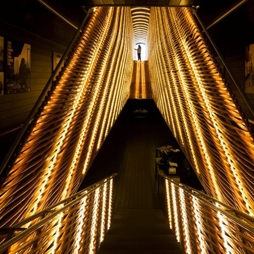 Matadero ศูนย์วัฒธนธรรม แห่งกรุงมาดริด ประเทศ สเปน เป็นสถานที่ซึ่งรวมเอา โรงภาพยนตร์ กับ ห้องสมุด ผุดในที่เดียวกัน ถือเป็นการผสานองค์ประกอบการเรียนรู้ที่ลงตัว ด้วยดีไซน์ล้ำออกแบบให้พื้นและผนังเป็นสีดำ ตัดด้วยแสงสว่างจากหลอดพลาสติกซึ่งถักทอกันเป็นกำแพง เพดาน บันได บันดาลใจให้คนอยากพัฒนาสมอง ส่องความรู้ ที่ โรงหนัง บวก คลังหนังสือ Matadero ..........!