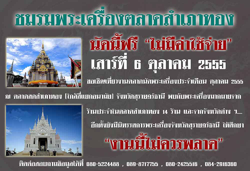 เชิญเที่ยวงาน ตลาดนัดพระเครื่องประจำเดือนตุลาคม วันเสาร์ที่ 6 ตุลาคม 2555 ตั้งแต่เวลา 09.00น. ณ ตลาดสำเภาทอง จังหวัดสุราษฎร์ธานี...พบกับร้านพระเครื่องประจำ และแผงพระ จากจังหวัดต่าง ๆ...พร้อมชมนิทรรศการพระเครื่องจังหวัดสุราษฎร์ธานี ขนาดย่อม...เพราะฉะนั้นงานนี้ไม่ควรพลาดครับ...ทั้งผู้เช่า และแผงพระต่าง ๆ ไม่มีค่าใช้จ่าย...จึงประชาสัมพันธ์ให้ทราบกันครับ |