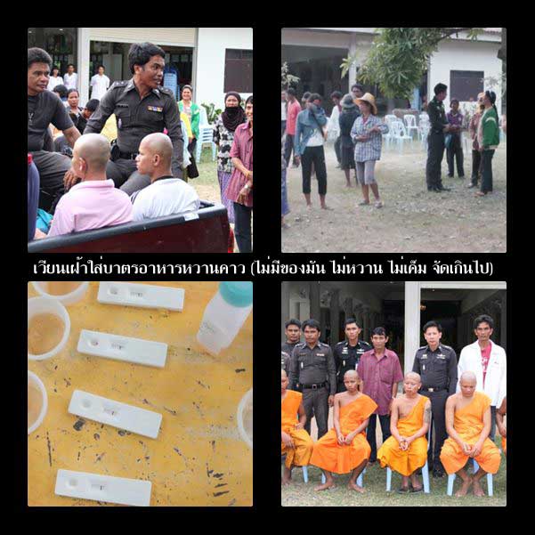 จากนั้น เจ้าหน้าที่ตำรวจ ได้นำพระสงฆ์ จำนวน 5 รูป มาทำการตรวจปัสสาวะหาสารเสพติด โดยมีบรรดาญาติโยม พ่อ แม่ และญาติพี่น้อง มาร่วมสังเกตการณ์ การทำงานของเจ้าหน้าที่ตำรวจ โดย พ.ต.ท.วรพงษ์ มดทอง สารวัตรใหญ่ สภ.เทนมีย์ ได้อธิบาย ข้อกฎหมาย ให้กับหลวงพ่อน้อย สังวะโร เจ้าอาวาสสำนักสงฆ์พฤษาศรัทธาธรรม ได้ รับทราบ และขออนุญาต ในการปฏิบัติหน้าที่