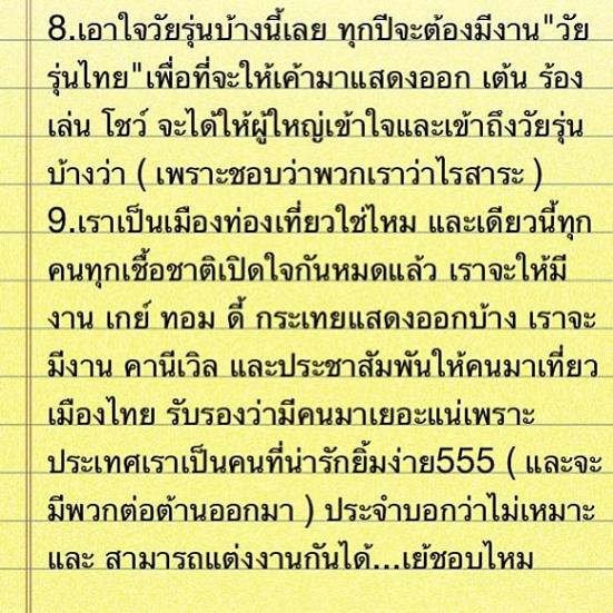 9. เราเป็นเมืองท่องเที่ยวใช่ไหม และเดี๋ยวนี้ทุกคนทุกเชื้อชาติเปิดใจกันหมดแล้ว เราจะให้มีงาน เกย์ ทอม ดี้ กะเทยแสดงออกบ้าง เราจะมีงานคานิเวิล และประชาสัมพันธ์ให้คนมาเที่ยวเมืองไทย รับรองว่ามีคนมาเยอะแน่ เพราะประเทศเราเป็นคนที่ยิ้มง่าย และสามารถแต่งงานกันได้