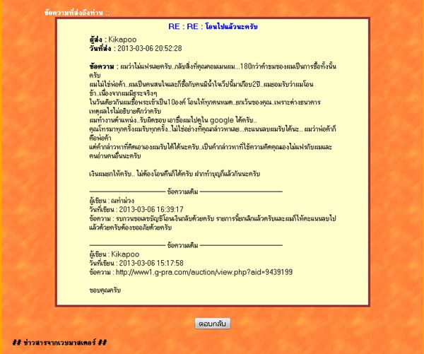 ด้วยกระทู้ที่ว่า66466 เหรียญเสมาหัวโต รุ่นทูลเกล้าปี30 จัดว่าสวยครับ ณท่าม่วง (207)(1) 366 5,040 - ศ. - 22 ก.พ. 2556 - 01:29:07 น. 5,040 Kikapoo (186)(1) https://www.g-pra.com/auction/view.php?aid=9439199 ได้มีกรณีพิพาก การให้คำติกัน(โหวตลบ)โดยที่ผมเป็นผู้ตั้งประมูลและคุณKikapooเป็นผู้ชนะการประมูล กาลเวลาผ่านไปตามกฏดั่งคำที่ผมโหวตให้ลบและผลก็คือผมโดนโหวตลบกลับโดยผู้ที่ทำผิดกฎการร่วมประมูล จริงๆแล้วผมให้หมดนะถ้าผู้ชนะการประมูลไม่พร้อมและยอมรับตรงๆ แถมวันนี้พอผมตั้งประมูลใหม่ก็ดันโอนเงินมาผมติดต่อกลับจะคืนให้ ก็เลยมีปากเสียงกันหนักๆ รบกวนเวปช่วยพิจารณาลบคำติของผมได้ไหมครับและรบกวนช่วยเป็นตัวกลางในการคืนเงินด้วยครับ |