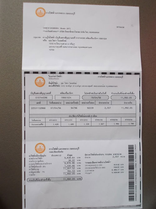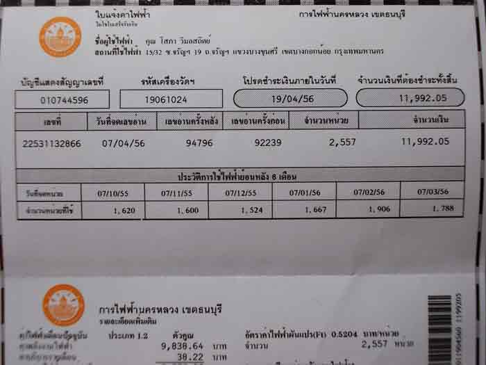 ใบแจ้งค่าไฟฟ้าจากการไฟฟ้านครหลวงฯ สำหรับเดือนที่ผ่านมาจนถึงวันที่ 7 เมษายน 2556 ... บ้านผม(ไม่รวมบ้านลูกสาวคนโตปลูกในเนื้อที่เดียวกัน)เป็นบ้านพักอาศัยธรรมดา ไม่ได้ทำธุรกิจค้าขาย หรืออุตสาหกรรมขนดเล็ก-กลาง-ใหญ่ ใดใดทั้งสิ้น แต่มีห้องนอนติดแอร์ 6 ห้องกับห้องรับแขกที่ติดแอร์ขนาดใหญ่ 38000 BTU อีก 1 ตัว
