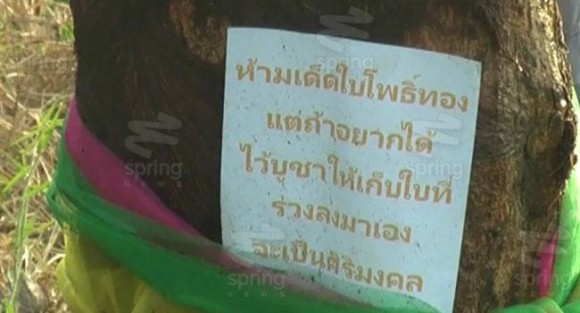 ป้ายกระดาษมีข้อความ "ห้ามเด็ดใบโพธิ์ทอง ถ้าอยากได้ไว้บูชาให้เก็บใบที่ร่วงหล่นลงมาเอง จะเป็นศิริมงคล" ถูกนำมาติดไว้บริเวณโคนต้นโพธิ์ทอง ข้างสนามฟุตบอลใกล้วัดท้ายย่าน ต.ศาลาแดง อ.เมือง จ.อ่างทอง หลังสื่อนำเสนอถึงความแปลกที่ต้นโพธิ์ต้นดังกล่าวมีใบสีทองทั้งต้น จนกระทั่งชาวบ้านแห่เดินทางมาเด็ดใบนำไปบูชาจนเกือบหมดทั้งต้น