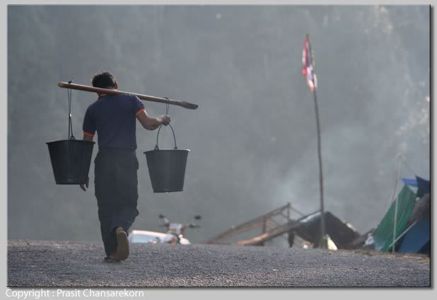 ชายจีนคนหนึ่งแบกถังน้ำสองใบไว้บนบ่าเพื่อไปตักน้ำที่ริมลำธาร