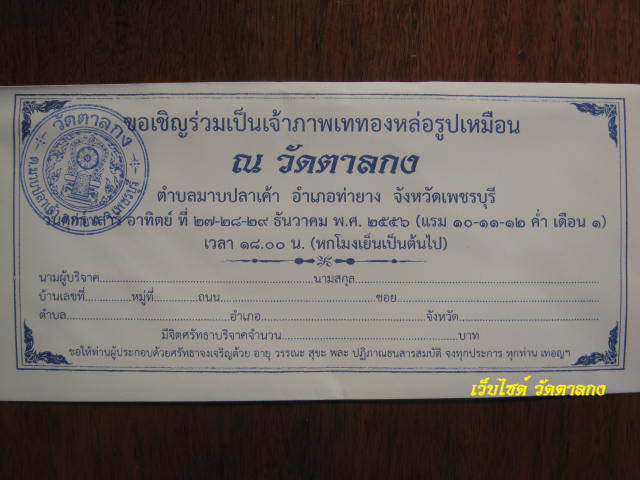ผู้มีจิตศรัทธาบริจาคทุนทรัพย์ เขียนชื่อ นามสกุล วัน เดือน ปีเกิด ลงในแผ่นทอง แล้วส่งกลับมาที่วัดตาลกง