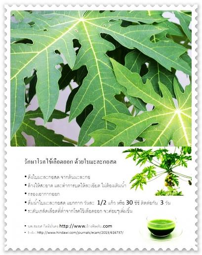วันที่ 12 ก.ย. นพ.สมยศ กิตติมั่นคง หัวหน้ากลุ่มพัฒนาการดูแลรักษาผู้ติดเชื้อเอชไอวี/เอดส์ กรมควบคุมโรค กระทรวงสาธารณสุข ให้สัมภาษณ์ว่า มีเรื่องน่าสนใจเกี่ยวกับการรักษาโรคไข้เลือดออกแนวใหม่ ที่หลายคนอาจจะยังไม่รู้ โดยจากการศึกษาข้อมูลซึ่งไปเจอโดยบังเอิญ พบว่า สามารถใช้ใบมะละกอสดมาคั้นน้ำดื่มควบคู่กับการรักษาแผนปัจจุบัน จะทำให้เกล็ดเลือดของผู้ป่วยโรคไข้เลือดออกเพิ่มขึ้นได้ภายใน 24-48 ชม.ช่วยลดอัตราการตายลงได้ ยังงงว่าประเทศไทยไม่มีการพูดถึงเรื่องนี้ ทั้งที่ใบมะละกอบ้านเรามีเยอะแยะ อีกทั้งช่วงนี้มีคนเสียชีวิตจากโรคไข้เลือดออกจำนวนมาก