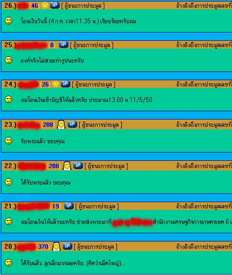 วอนผู้ประมูล-ตั้งประมูลยังไม่นานโปรดระวังเรื่องนี้ด้วยนะครับ ถ้าไม่พอใจโทรมาด่าได้เลยครับ ยอมรับทุกประการถ้าบริการไม่ดี การให้feedbackเฉยๆนั้นเขาให้ในกรณีที่ไม่พอใจในการบริการหรือพระหมดเม็ดแต่งเติมเสริมมาครับ หรือพี่ๆคิดเห็นเป็นเช่นไร ช่วยแถลงไขให้น้องได้รู้มั่งครับ |