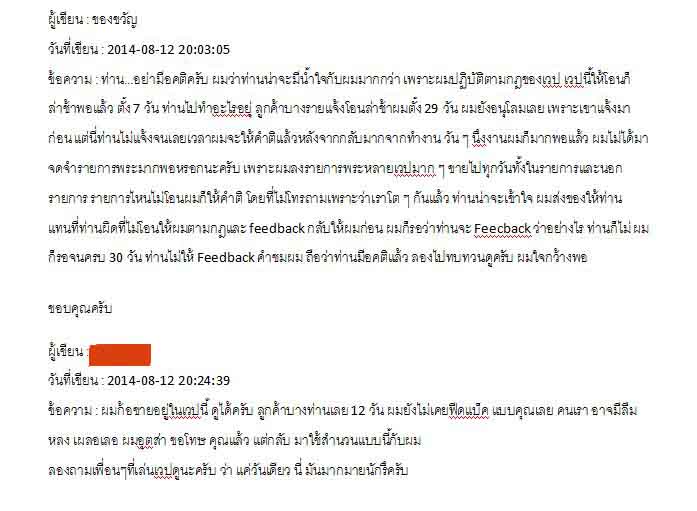 ผมลงประมูลพระไป มีสมาชิกปิดผมได้แล้วไม่โอนเงินครบเวลาที่กำหนดคือ 7 วัน พอถึงวันที่ 8 ผมกำลังจะให้คำติ เปิดมาเจอก็ได้ข้อความทักเข้ามา บอกว่า ทำรายการตกหล่น เดี๋ยวจะโอนให้ ตอนเย็น ซึ่งเป็นวันที่ 8 แล้ว และผมกำลังจะให้คำติไป ผมก็ให้โอนกาสและบอกว่า ทีหลังอย่าทำตกหล่นบ่อยนะครับ เพราะผมกำลังจะให้คำติไป เห็นไม่ติดต่อกลับมา และผมก็ส่งของไปให้ รอจนครบ 30 ท่านนี้ก็ไม่ให้ Feedback คำชมผม ซึ่งปกติแล้ว ผมคนขายควรให้คำชมลูกค้าก่อน แต่รายการนี้เขาโอนเลยเวลา ผมก็คิดว่าเขาจะมีน้ำใจ ให้คำชมผมก่อน แต่ก็ไม่ จน Feedback ให้โดยระบบ แล้วตอนเย็นก็เขียนเข้ามาต่อว่าผม ว่าไม่มีน้ำใจ ลองอ่านดูครับ ผมถามพี่ ๆ เพื่อน ๆ หน่อยเถอะครับ ว่าผมผิดหรือเขาผิดกันแน่...