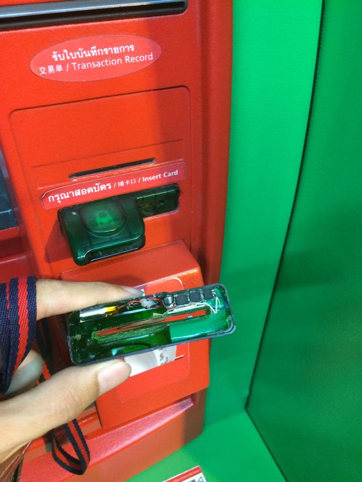 ผู้เสียหายเปิดเผยผ่านเฟซบุ๊กส่วนตัว ระบุว่า ขณะที่ตนเสียบบัตรเอทีเอ็ม สังเกตไฟบริเวณช่องเสียบบัตรไม่กระพริบ เมื่อลองเคาะออกมาจะรู้สึกหลวม คล้ายจะหลุดออกมา และเมื่อดึงออกมาเบาๆ จึงพบว่ามีคนร้ายทำกรอบพลาสติกสีเขียวครอบอีกชั้น ภายในมีวงจรที่เรียกว่าเครื่องสกิมมิง สำหรับอ่านข้อมูลจากแถบแม่เหล็กบนบัตรเอทีเอ็ม จากนั้นเมื่อสังเกตด้านบนเครื่องเอทีเอ็มพบกล้องรูเข็มขนาดเล็กถูกติดตั้งประกบเข้ากับก้านสีเขียวสำหรับติด้านบนเครื่องเอทีเอ็ม ซึ่งหากไม่สังเกตก็จะไม่รู้ คิดว่าเป็นของธนาคาร คาดว่าเป็นขบวนการโจรกรรมข้อมูลจากบัตรเอทีเอ็ม เพื่อปลอมแปลงบัตรนำไปกดเงินสดออกจากบัญชี