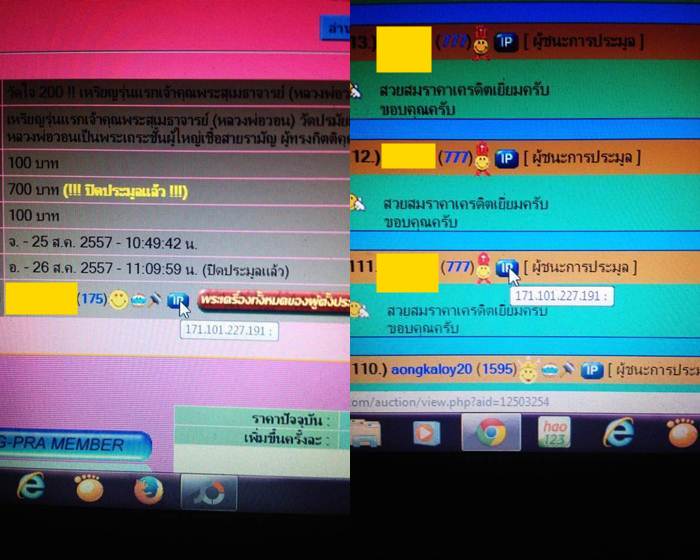 ประเด็นมีอยู่ว่า พอดีสงสัยคนบิทค่ะ เลยเอาเม้าท์จี้เลข IP ดู เลขหน้า เหมือนกัน 2 ตัวผิดแค่เลขหลังค่ะ คราวนี้ก็เลยดูรายการอื่น ที่เค้าไล่ตามเคาะดันราคากัน พบว่า IP ตรงกันทุกตัวเลยค่ะ