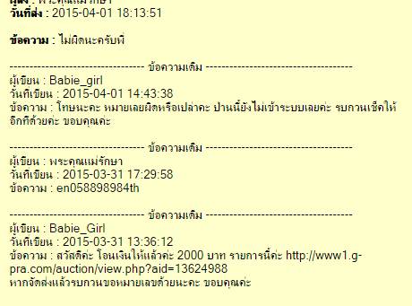 แบบว่าโอนเงินไปแล้ว แล้วเจ้าของพระก็มาแจ้งหมายเลข EMS แต่พอนำไปเช็ค ไม่มีเข้าระบบ เวลาผ่านไป 2 ก็ยังไม่เข้าระบบ พอสอบถามไปก็บอกว่า ส่งแล้ว ไม่ชอบเลยแบบนี้ หลายรอบล่ะค่ะ ยูเซอร์นี้ ไม่ชอบเลย ส่งก็บอกส่ง ไม่ส่งก็บอกมาตามตรง จะไม่ว่าอะไรเลย นี่ต้องมานั่งรอของจะมาตอนไหนก็ไม่รู้ สงสัยจับเสือมือเปล่ารอของส่งมาแน่ๆ จริงอยู่แค่ผ่านมาแค่ 2-3 วัน แต่ก็เสียความรู้สึกตรงที่โกหกว่าส่งนี่ล่ะค่ะ เห้อออออออ |