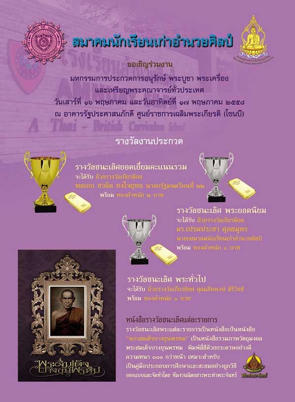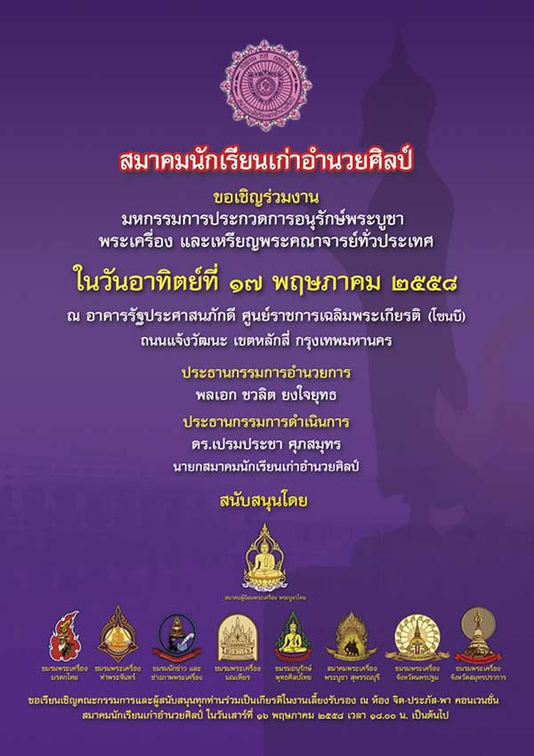 งานประกวดพระเครื่อง 17 พ.ค.58 สมาคมนักเรียนเก่าอำนวยศิลป์ รายการประกวดพระเครื่อง ที่ทุกท่านไม่ควรพลาด ขอเชิญร่วมงานมหกรรมงานประกวดพระเครื่อง พระบูชาและเหรียญคณาจารย์ ณ อาคารรัฐประศาสนภักดี (อาคาร B) ศูนย์ราชการเฉลิมพระเกียรติ 80 พรรษา 5 ธันวาคม 2550 ถ.แจ้งวัฒนะ แขวงทุ่งสองห้อง เขตหลักสี่ กรุงเทพฯ