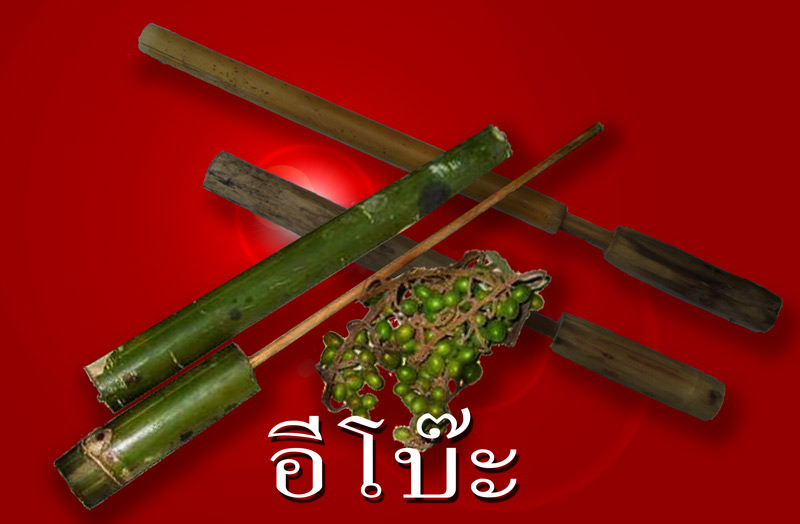 อีโบ๊ะ ลักษณะตามภาพ ทำจากไม้ไผ่ลำเล็กๆ นำมาตัด ทำเป็นตัวลำกล้อง และทำเป็นตัวไม้ไว้แยงกระแทกเข้าไปในลำไผ่นั้น