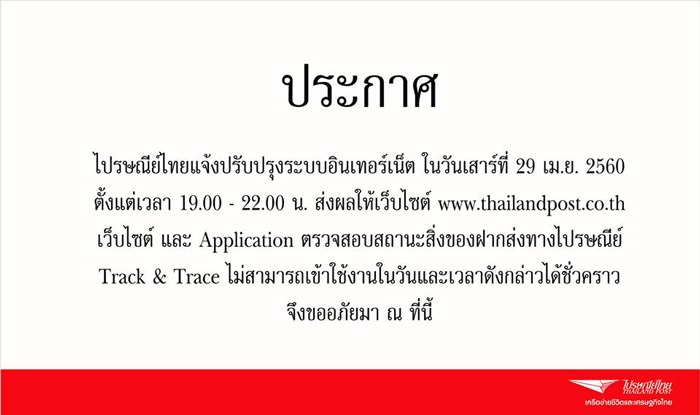 ไปรษณีย์ไทยแจ้งปรับปรุงระบบอินเทอร์เน็ต ในวันเสาร์ที่ 29 เม.ย. 2560