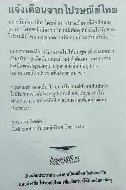 เตือนเพื่อนๆ พี่ๆ เบอร์โทรมาแจ้ง "ท่านมีพัสดุ ที่ยังไม่ได้รับจากไปรษณีย์ไทย" พอรับสายให้กด 9 มีเสียงผู้หญิงแจ้งจะตรวจสอบให้ ขอชื่อ-นามสกุล และเลขบัตรประชาชน ผมไม่ได้ให้ไป งงๆว่าไปรษณีย์มีบริการแบบนี้หรอ เลยบอกว่าจะโทรไปที่ไปรษณีย์แถวบ้านเอง แจ้งพี่ๆเพื่อนๆ ระวังด้วยครับ เจอกะตัวเอง ถ้าให้ไปไม่รู้ว่าจะมีผลกับตัวอย่างไร.....เบอร์ที่โทรมา T. 02-573-0116 ครับ..... |
