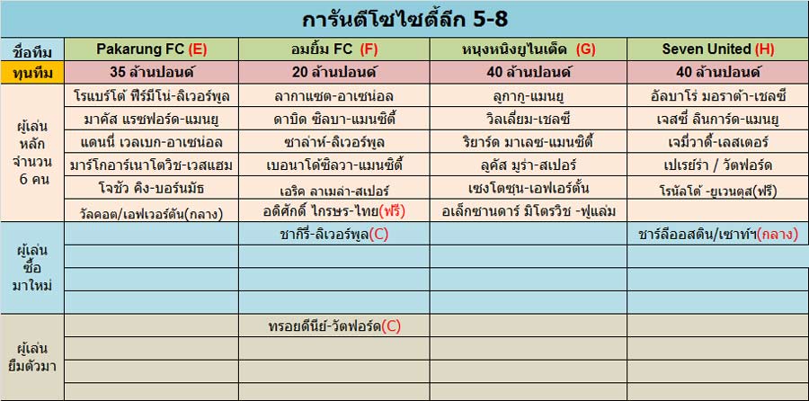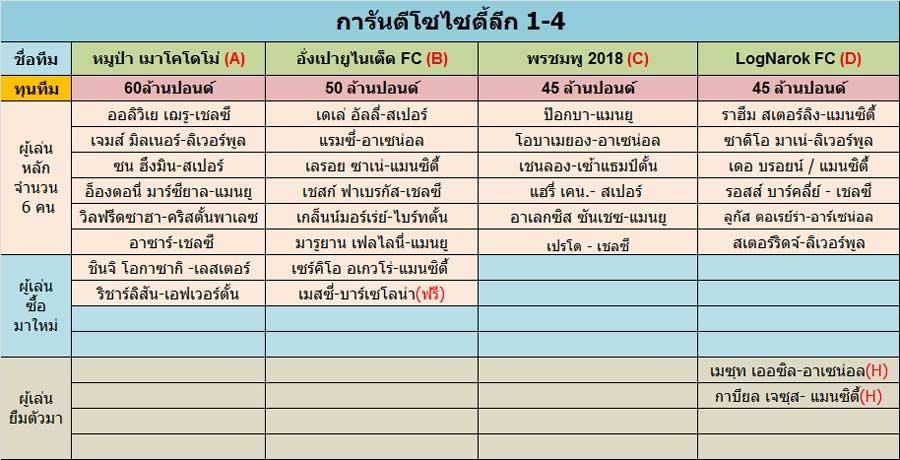 - ตัวซื้อมาใหม่จากทีมอื่นให้วงเล็บว่า (NEW) เช่น ป๊อกบา-แมนยู (NEW) ถ้าซื้อตลาดกลางไม่ต้องวงเล็บ