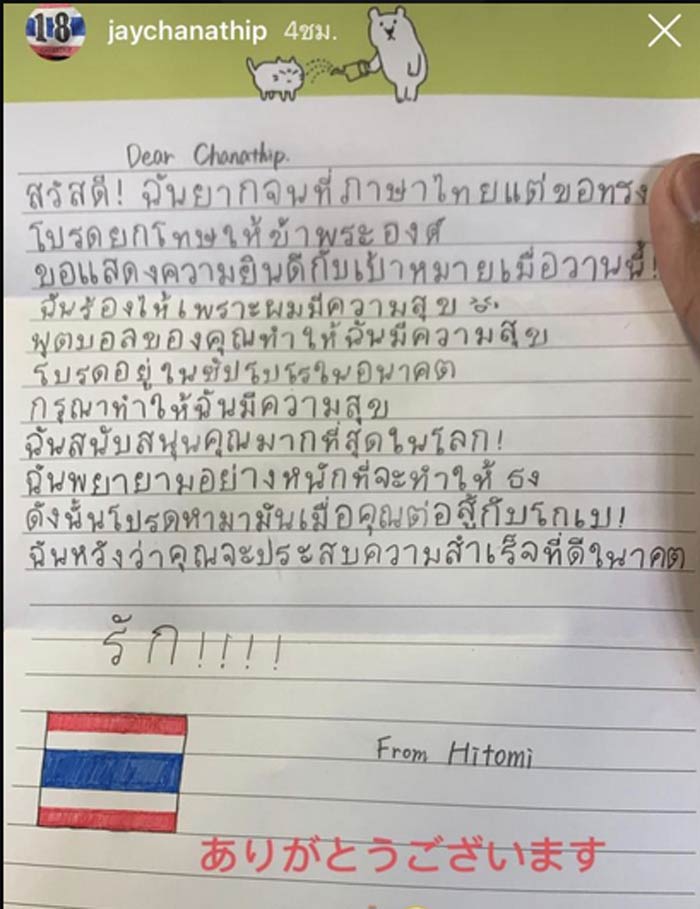 มีเรื่องดีๆเกิดขึ้นกับชีวิตการค้าแข้งของ ชนาธิป สรงกระสินธ์ อีกครั้ง หลังจากพาทีมบุกไปเชือด จูบิโล่ อิวาตะ 2-1 ในเจ ลีก 2019 เมื่อวันอาทิตย์ที่ 28 เม.ย.ที่ผ่านมา โดยเขาได้อัพรูปจดหมายผ่านทางไอจีสตอรี่ของตัวเอง เมื่อมีแฟนบอลรายหนึ่งส่งมาให้