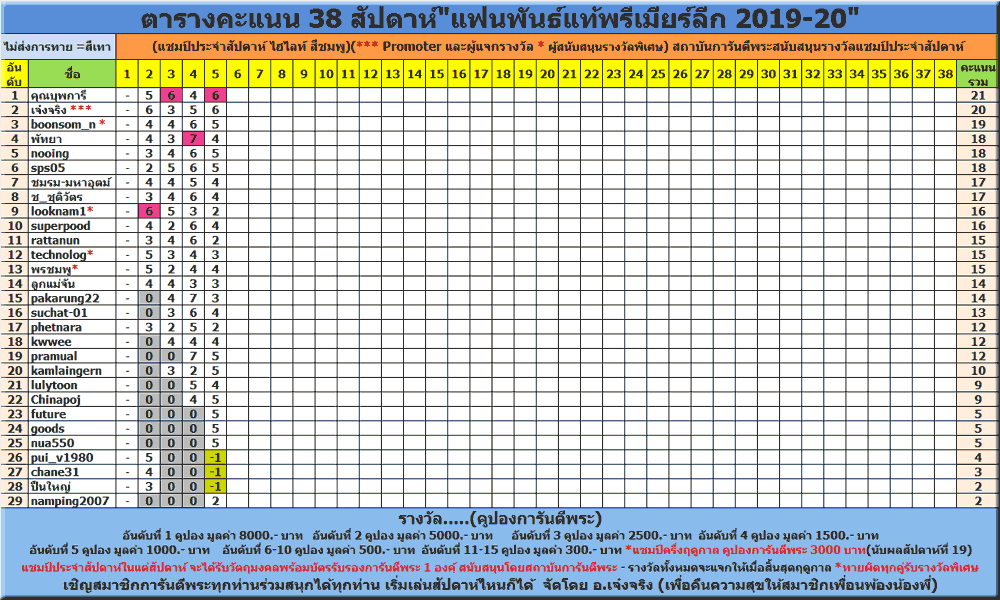 สัปดาห์ที่ 5 ผ่านไปแล้ว นำตารางสรุปอันดับคะแนนมาแจ้งให้ทราบ เพื่อจะได้ว่างแผนการเล่นในสัปดาห์ที่ 6 กันได้แบบ รู้เขารู้เรา