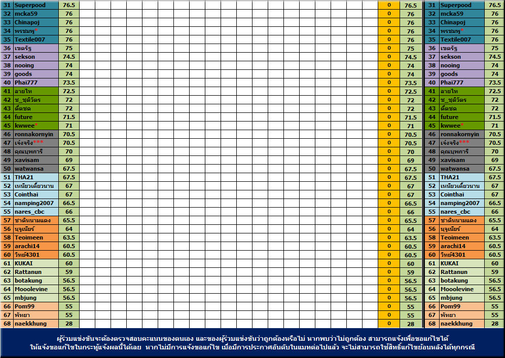 ****สมาชิกผู้ร่วมกิจกรรมทุกท่าน ต้องเป็นผู้ร่วมตรวจสอบคะแนนต่างๆด้วยนะครับ ทุกคะแนนหากมีการประกาศผลในสัปดาห์ต่อไปแล้ว