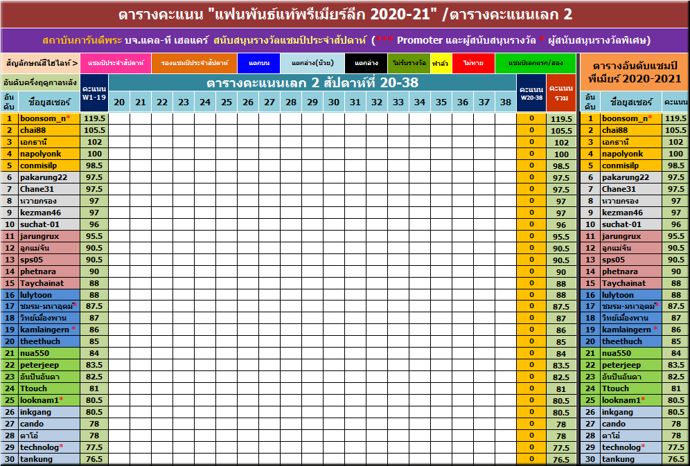 หลังจากการแข่งขันผ่านไป 19 สัปดาห์ เราได้แชมป์รองแชมป์อันดับ 1-2 ของครึ่งฤดูกาลแรกแล้วครับ