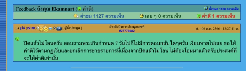 ผมโดนติ เนื่องจาก เกินกำหนด ผู้ตั้งประมูล ติดต่อในอินบ๊อก บอกไร้การติดต่อจากผม (โทรเตือนผมสักครั้งก็ยังดีว่าเกิดอะไรขึ้น ถ้าผมจงใจก็ติมาเลย) ผมเปิดมาเห็นรีบโทรหาผู้ตั้ง แต่ผู้ตั้งไม่คุยบอกให้อินบ๊อก
