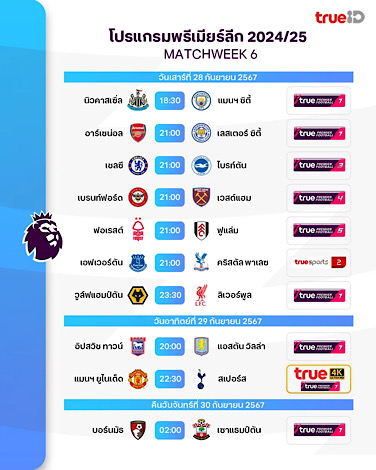 หัวข้อกระทู้ : ทายผล...เกมส์"แฟนพันธ์แท้การันตี-พรีเมียร์ลีก 2024-25" สัปดาห์ที่ 6(28-1/9-10/67)