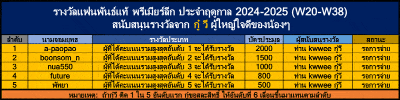 ผู้ที่ได้รับรางวัล 5 ท่านที่ทำคะแนนสะสมได้สูงสุด ตามรายชื่อดังในตารางที่แนบมา ขอแสดงความยินดีกับทุกท่านด้วยครับ สวดยวดมาก