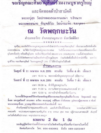 ขอเชิญคณะศิษยานุศิษย์ร่วมงานบูชาคณุใหญ่ และจัดทอดผ้าป่าสามัคคี หลวงปู่ศุข วัดปากคลองขะขามเฒ่า จ.ชัยนาท , หลวงพ่อหน่าย อินฺทสิโล วัดบ้านแจ้ง จ.อยุธยา ณ วัดพฤกษะวัน ต.หอไกร อ.บางมูลนาก จ.พิจิตร