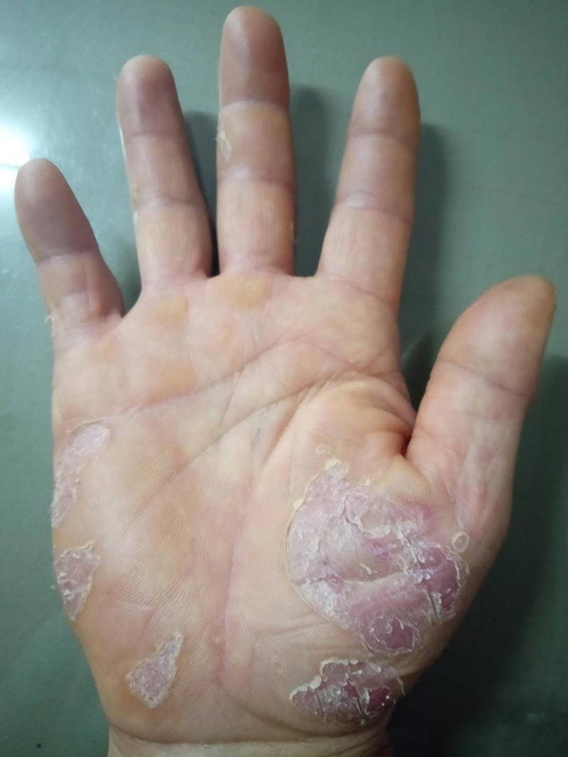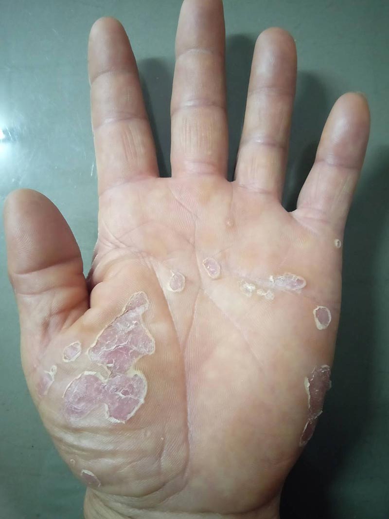 ขออนุญาตสอบถามครับ โรคผิวหนัง ส่วนใหญ่เป็นที่มือและใบหน้าบริเวณหน้าผาก (ตีนผม)