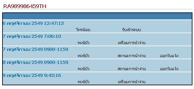 ของผมส่ง EMS ไปให้ผู้ประมูลได้ตั้งแต่วันที่ 4 พ.ย. อีก 2 วันต่อมาส่งไปให้อีก 1 ฉบับ ฉบับแรกไปรษณีย์ไม่นำจ่ายจนถึงวันที่ 11 พ.ย. ฉบับที่ 2 ตีกลับมาที่บ้าน เอะใจโทรไปถามที่อยู่ผู้ประมูลตรวจสอบแล้วถูกต้อง ตัวหนังสือจ่าหน้าตัวใหญ่บรรจงอ่านง่าย จึงได้รู้ความจริง ว่าฉบับแรกผู้ประมูลก็ยังไม่ได้รับ จึงเข้าเวบไปรษณีย์ไทยเช็คดู จึงรู้ว่า ฉบับแรกที่ส่งไปเมื่อวันที่ 4 พ.ย. ถึง ไปรษณีย์บางกะสอนนทบุรีวันที่ 5 พ.ย. มันไม่นำจ่าย ไปเก็บค้างไว้จนถึง วันที่ 11 พ.ย. ต้องให้ผู้ประมูลไปตามถึงที่ทำการ จึงได้มา ทั้งๆที่บ้านเขาอยู่ริมถนนใหญ่