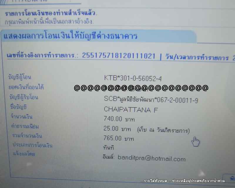 รายการที่ท่านชนะประมูล ผมได้ โอนเงิน เข้าบัญชี มูลนิธิชัยพัฒนา ให้แล้วครับ เลขที่บัญชี 0672000119 ธนาคารไทยพานิช ออมทรัพย์ ขอขอบคุณ พี่ วัลยา มากครับ ขอให้ท่านและครอบครัว จงมีแต่มีความสุขความเจริญ ยิ่งๆขึ้นและตลอดไปครับ