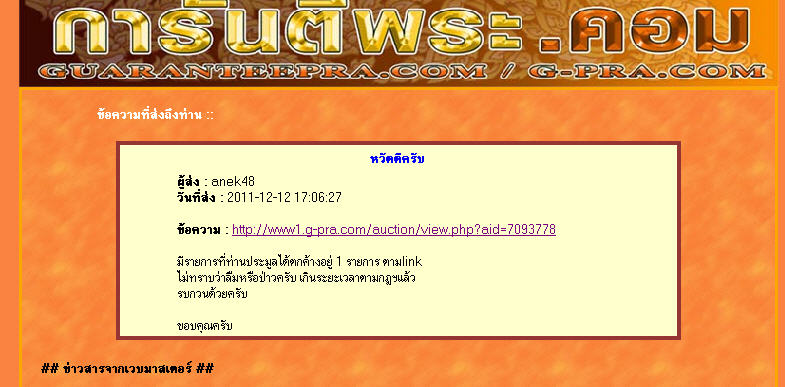 รายการนี้ปิดประมูลไป 3/12/2554 คุณพี่ชนะประมูล ถึงวันนี้ 14/12/2554 รวม 11 วันแล้วครับ ยังไม่ได้โอนเงินให้กะผมเลย