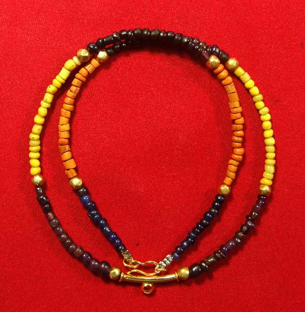 ความยาว 17 นิ้ว ร้อย2วันเสร็จพอดีครับ มีสีม่วง เหลือง สีดำ สีอิฐ สีน้ำเงินกษัตย์ ตัวกลางและตะของานทองสั่งทำ เม็ดทองหุ้มครั่ง 10 เม็ด สำหรับความเชื่อแต่ละสีมีดังนี้ครับ สีม่วง คนเมตาสงสาร นำทรัพย์สินมาให้ อุปถัมภ์คอยช่วยเหลือ ส่งเสริมให้สูงส่งยิ่งขึ้น /สีเหลือง มีสเน่ห์ เมตามหานิยม คนรักใคร่ไม่เกลียดชัง /สีดำ กันผีสาง นำโชค /สีอิฐ ป้องกันเขี้ยวงา แมลงสัตว์กัดต่อย /น้ำเงินกษัตย์ มีอำนาจวาสนา ส่งเสริมวาสนาให้สูงขึ้น นำโชค  |