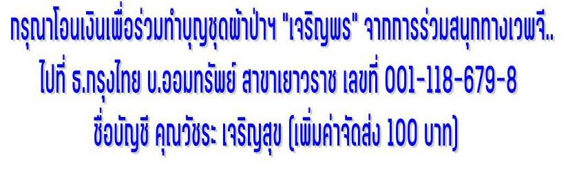 | หัวข้อกระทู้ : แจ้งหลักฐานการโอนเงิน ชุดผ้าป่า "เจริญพร" หลวงปู่ท่อน จากการร่วมสนุกทางเวพ G ได้ที่นี่ครับ |