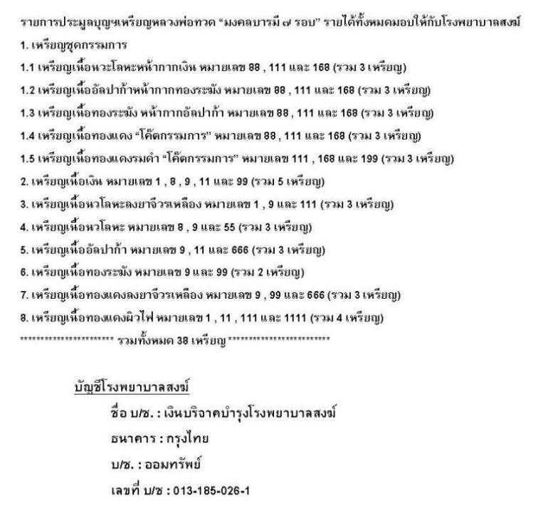 ตามที่ได้เปิดให้ร่วมประมูลทำบุญให้ รพ.สงฆ์ ฯ กับเหรียญหลวงพ่อทวด มงคลบารมี ๗ รอบ พ่อท่านเขียว วัดห้วยเงาะ จำนวน 38 รายการ จึงขอให้ท่านที่ปิดประมูลได้ช่วยทำการตรวจสอบชื่อ-นามสกุล ของท่านด้วยนะครับ เพื่อทางทีมงานจะได้ประสานงานกับทาง รพ.สงฆ์เพื่อทำการออกใบเสร็จรับเงิน และใบอนุโมทยาบัตร(นำไปลดหย่อนภาษีได้)รวมถึง พิมพ์ชื่อ-สกุลของท่านลงในสูจิบัตรฯ ต่อไปครับ จึงเรียนมาเพื่อทราบ...  |