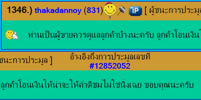 ผม thakadannoy ขอรับรองสมาชิกที่ใช้ชื่อ Usernam กาแฟ1 ท่านนี้ท่านเป็นสมาชิกที่อัธยาสัยดี และมีความรับผิดชอบดีเยี่ยม แต่ผมได้ให้FBท่านผิด ตามไฟล์ที่แนบมา จึงขอชี้แจงว่าท่านมิได้เป็นเช่นนั้น และผมขอรับผิดพร้อมขออภัยท่านด้วยครับ ขอบคุณครับ https://www.g-pra.com/auction/view.php?aid=12852052 |