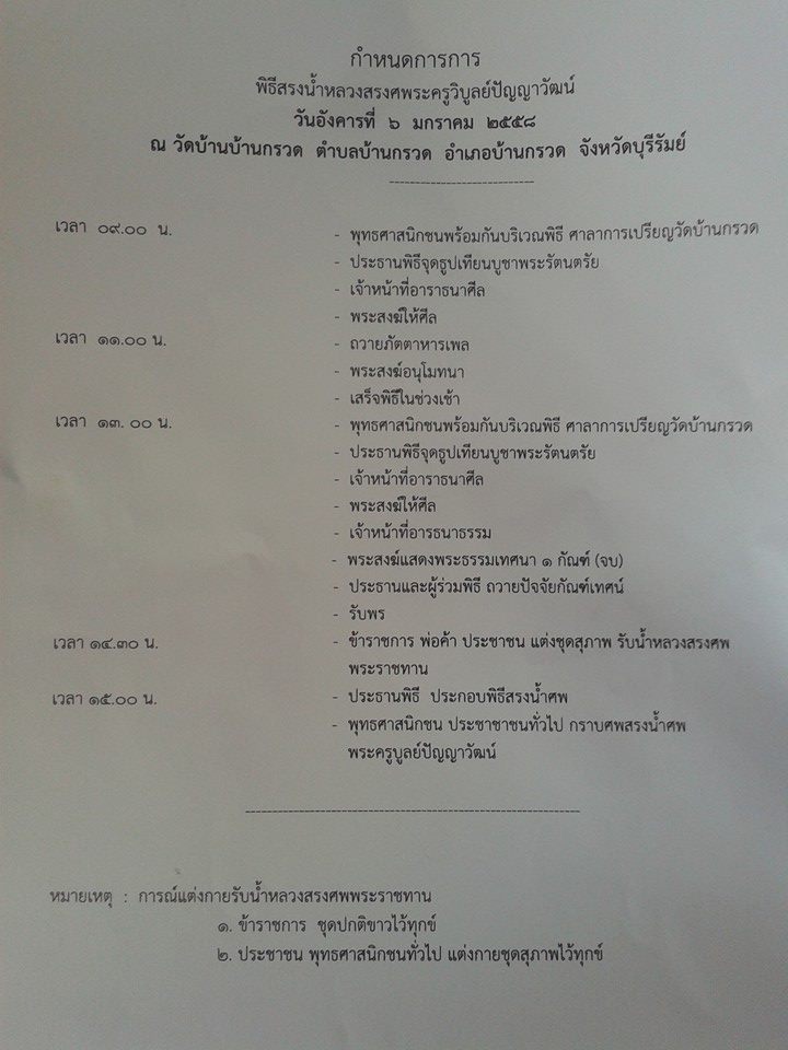 เชิญพุทธศาสนิกชนและศิษยานุศิษย์ พระครูวิบูลย์ปัญญาวัฒน์ หลวงปู่ผาด ฐิติปัญโญ เจ้าอาวาสวัดบ้านกรวด ร่วมงานพระราชทานน้ำหลวงสรงศพแด่พระเดชพระคุณหลวงปู่ผาด ฐิติปัญโญ ในวันอังคารที่ 6 มกราคม 2558 ตั้งแต่เวลา 13.00 น. เป็นต้นไปสำหรับท่านที่มาร่วมงานขอให้แต่งกายสุภาพจึงแจ้งมาเพื่อทราบ |