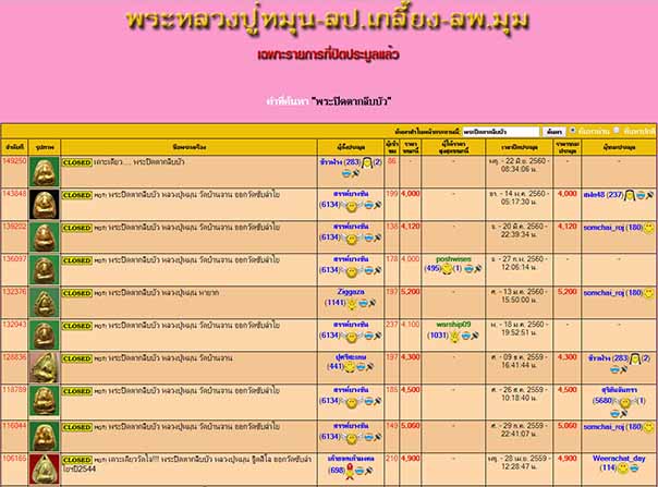 ผมถูกป้าย STOP เนื่องจากสมาชิกโหวต 3 ท่านขึ้นไป รายการลำดับที่ 150298 พระปิดตากลีบบัว หลวงปู่หมุน วัดบ้านจาน ออกวัดซับลำใย โดยเมื่อวันที่ 14 พ.ค.2560 พระองค์นี้ผมประมูลได้จากคุณสวรรค์บางซัน ในตอนนั้นไม่มีใครโหวต ซึ่งตอนนั้นก็ไม่รู้ว่าแท้หรือเปล่าพอผมเอามาออกปรากฎว่า โดนโหวต รบกวน WEBMASATER ตรวจสอบ ผู็โหวตด้วยครับน่าจะเป็นแกีงค์ที่ร่วมมือกันทำให้ผู้อื่นเสียหาย ผมจึงขอส่งประวัติรายการพระกลีบบัวที่มีผู้ประมูล เจ้าของเดียวกันและเจ้าของรายอื่นๆที่มีพระฯเนื้อหาลักษณะเดียวกันที่มาเดียว เขาขายมานานแล้วแต่ไม่โดนโหวตครับ |