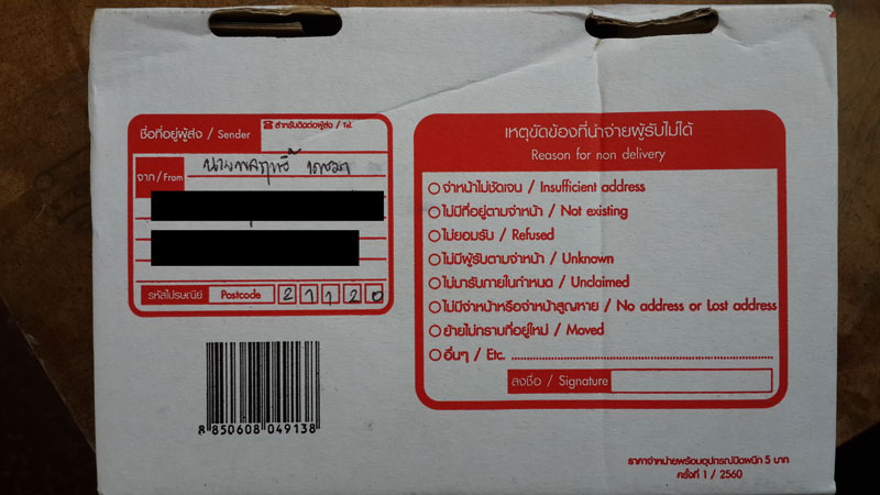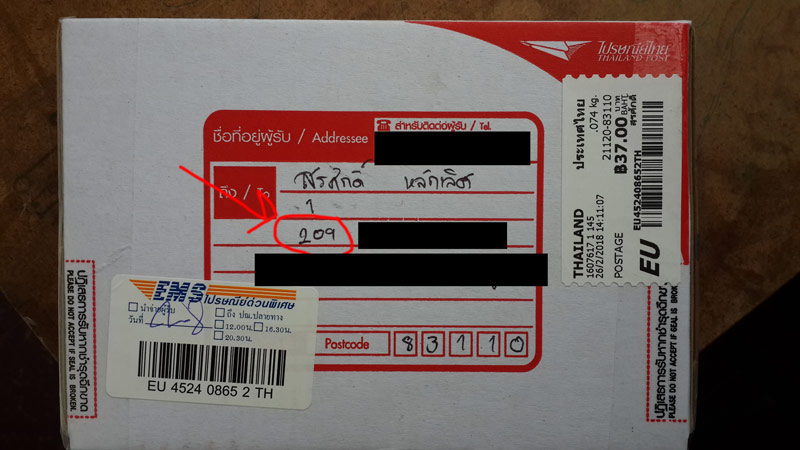กรณีของผมคือลงที่อยู่ผิด ซึ่งทำให้ผมต้องเสียเวลาตามของ ซึ่งเป็นความผิดพลาดของผู้ขายที่ควรตรวจสอบก่อนส่ง เพราะบ้านเลขที่มีความสำคัญต่อการนำจ่ายของทางไปรษณี และถ้าหากของสูญหาย หรือ เกิดปัญหา แน่นอนว่าทางไปรษณีไม่รับผิดชอบเนื่องจากจัดส่งที่อยู่ตามที่เขียนว่าบนกล่อง และสุดท้ายปัญหาจะมาเกิดกับผู้ซื้อและผู้ขาย |