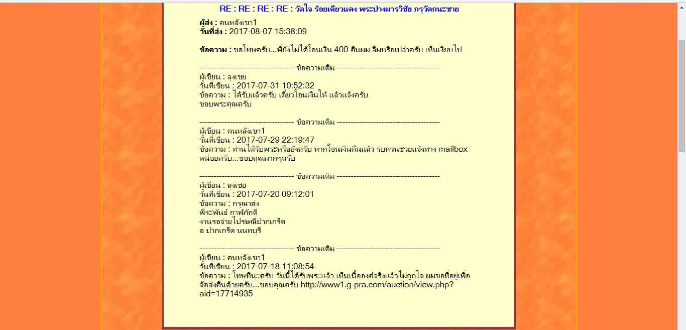 ปิดประมูลแล้ว โอนเงินเลย รับพระแล้วเห็นองค์จริงไม่ชอบใจ แจ้งคืนพระตามกฎรับประกันความพอใจในวันที่รับ ส่งคืนไปและผู้ตั้งประมูลได้รับพระแล้ว กลับไม่โอนเงินคืน โทรไปก็บอกจะโอน แต่ก็ไม่โอน โทรจนเบื่ิอ รอมาเดือนกว่าแล้ว แจ้งเวปไป เวปก็เงียบ ไม่ตอบอะไร เราต้องเสียตังฟรีหรือเปล่า ใครเคยโดนแบบนี้บ้าง |